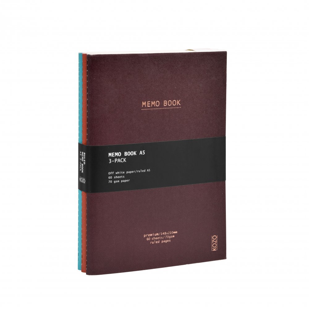 KOZO notesbog eller tyndere notesbog A5 med omslag i trendy i mange farver . Passer godt til KOZO penalhus og andre produkter i sortimentet. Hæfterne indeholder hver 60 linjerede sider. Holdbar og stilfuld syet binding. Papiret er cremefarvet og har en vægt på 70 g. Leveres i en pakke med 3 stk. Perfekt til studerende, forskellige farver til forskellige fag eller på arbejde til små noter. Tynde og fleksible hæfter, der ikke vejer meget og er nemme at putte ned i en rygsæk eller etui til bærbar computer.